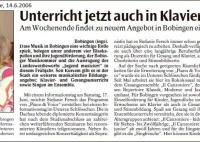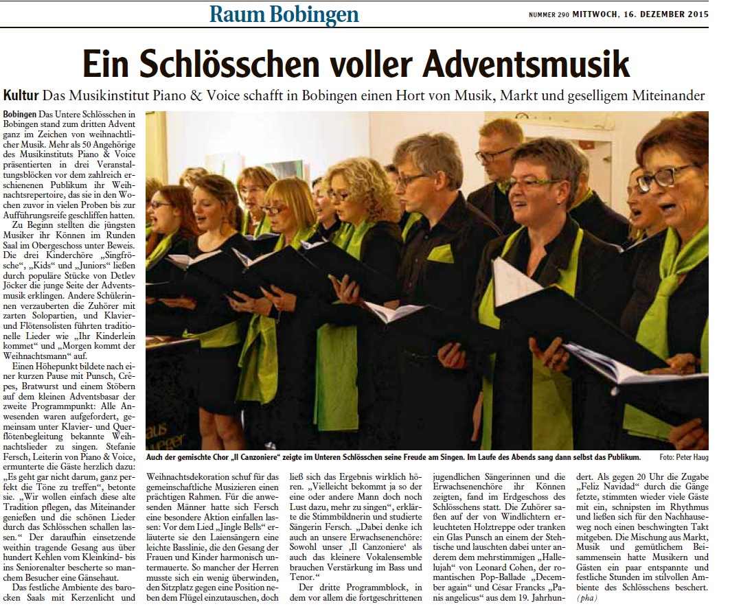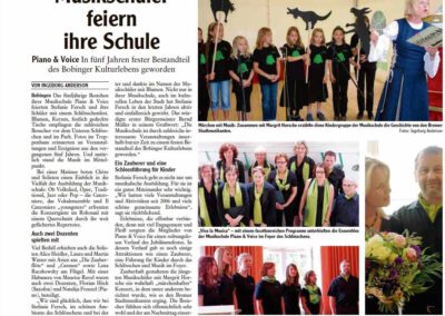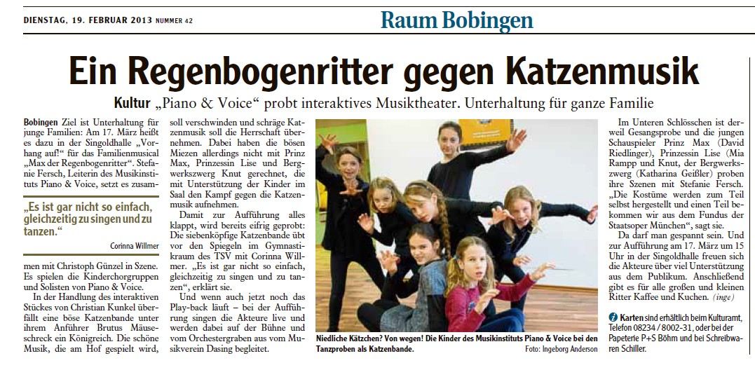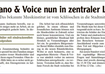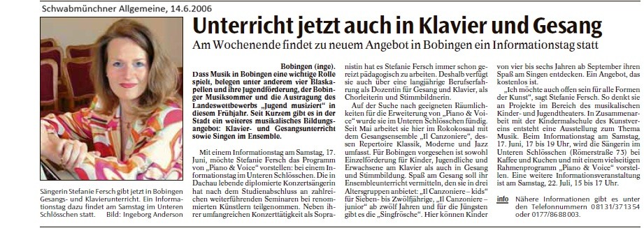 Fundus der Münchner Staatsoper. Die Kinderchöre waren in diesem Jahr außerdem präsent beim Mühlentag in der Mittleren Mühle Bobingen. Zum Abschluss des Schuljahres gab es ein Werkstattkonzert im Schlösschen, auf dem auch der Bobinger Zauberer Phil Rice auftrat. Piano & Voice wurde 2013 zudem offiziell als Musikinstitut anerkannt und erhält seitdem unter anderem das Qualitätszertifikat für Musikunterricht in Bayern. Denn Unterricht, Stimmbildung und Chorarbeit sind fachlich fundiert und staatlich anerkannt.