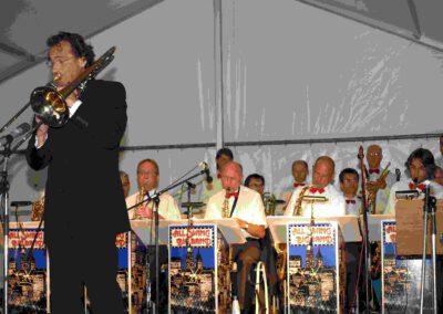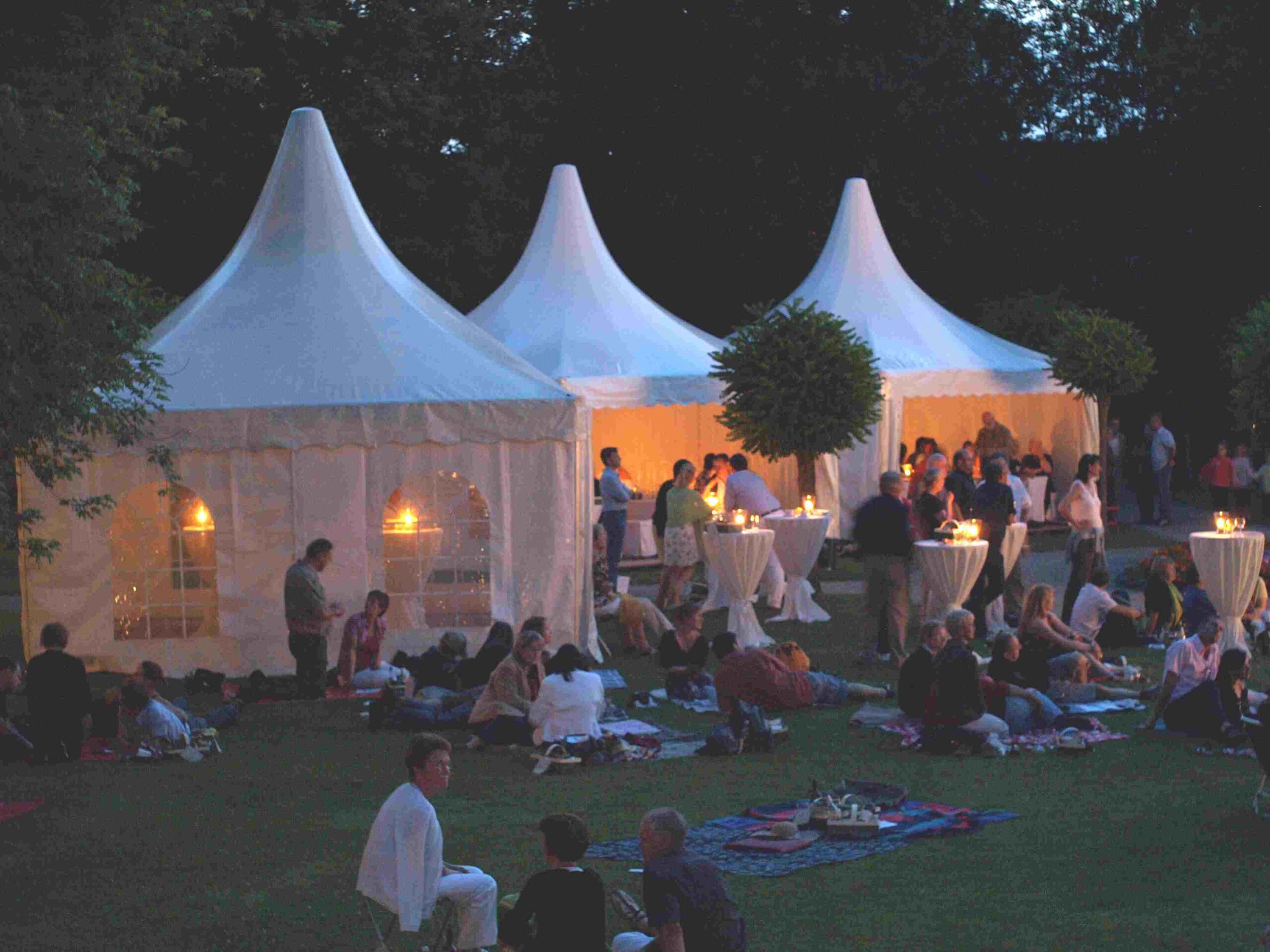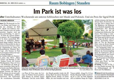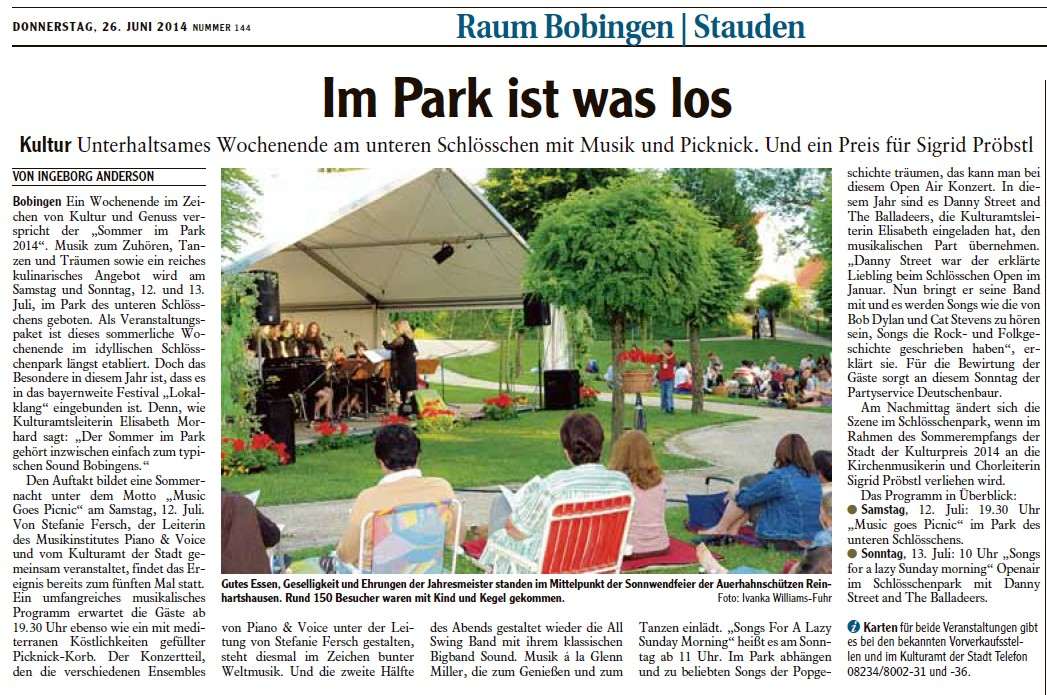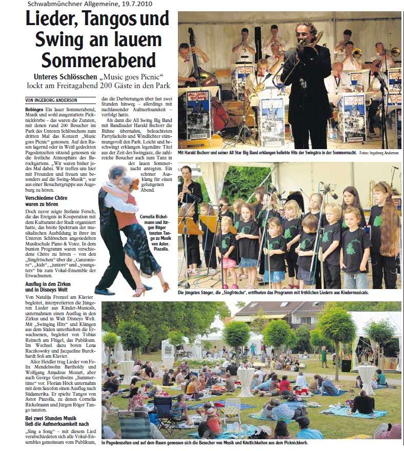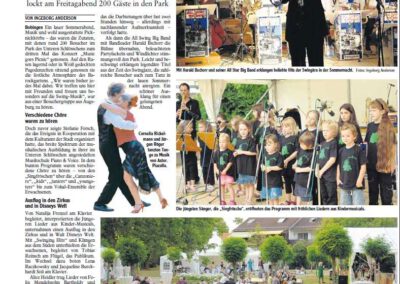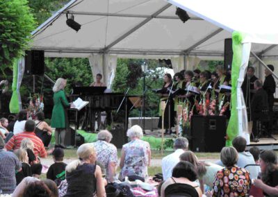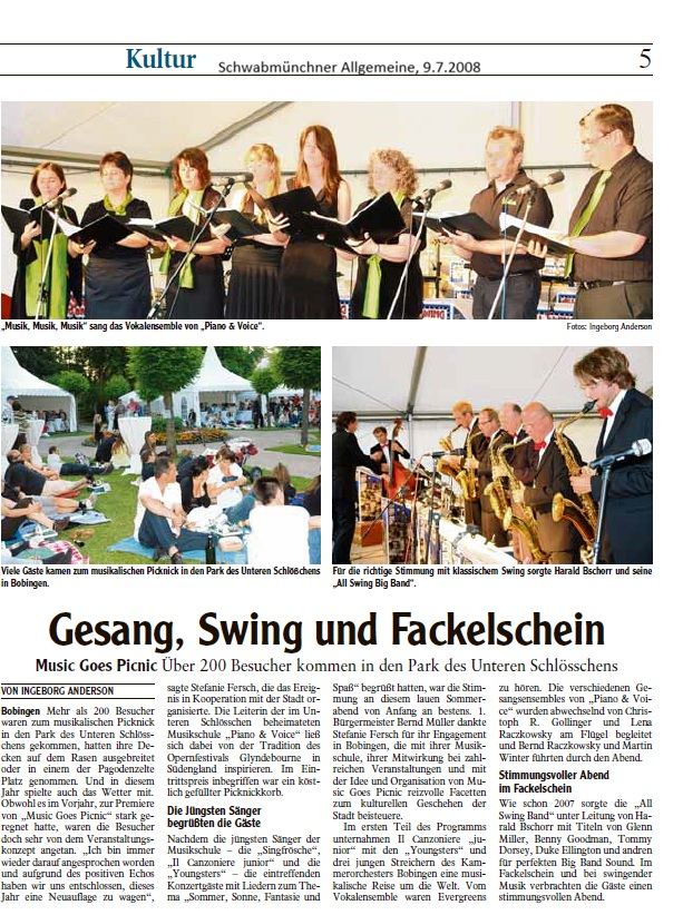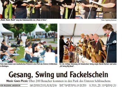Solisten und Vokalensembles von Piano & Voice traten unter Ferschs Leitung auf, begleitet am Flügel von Christoph R. Gollinger. Im zweiten Teil übernahm die All Swing Big Band unter Harald Bschorr und brachte Swingklassiker von Glenn Miller, Benny Goodman, Tommy Dorsey und Duke Ellington in den Park. Im Eintritt inbegriffen waren reservierte Plätze in Pagodenzelten und ein liebevoll bestückter Picknickkorb. Ergänzt wurde der Abend durch Führungen im Schlösschen sowie eine Mondscheinführung durch die Kunstausstellung – ein Fest für alle Sinne und ein Meilenstein in der Konzertgeschichte von Piano & Voice.