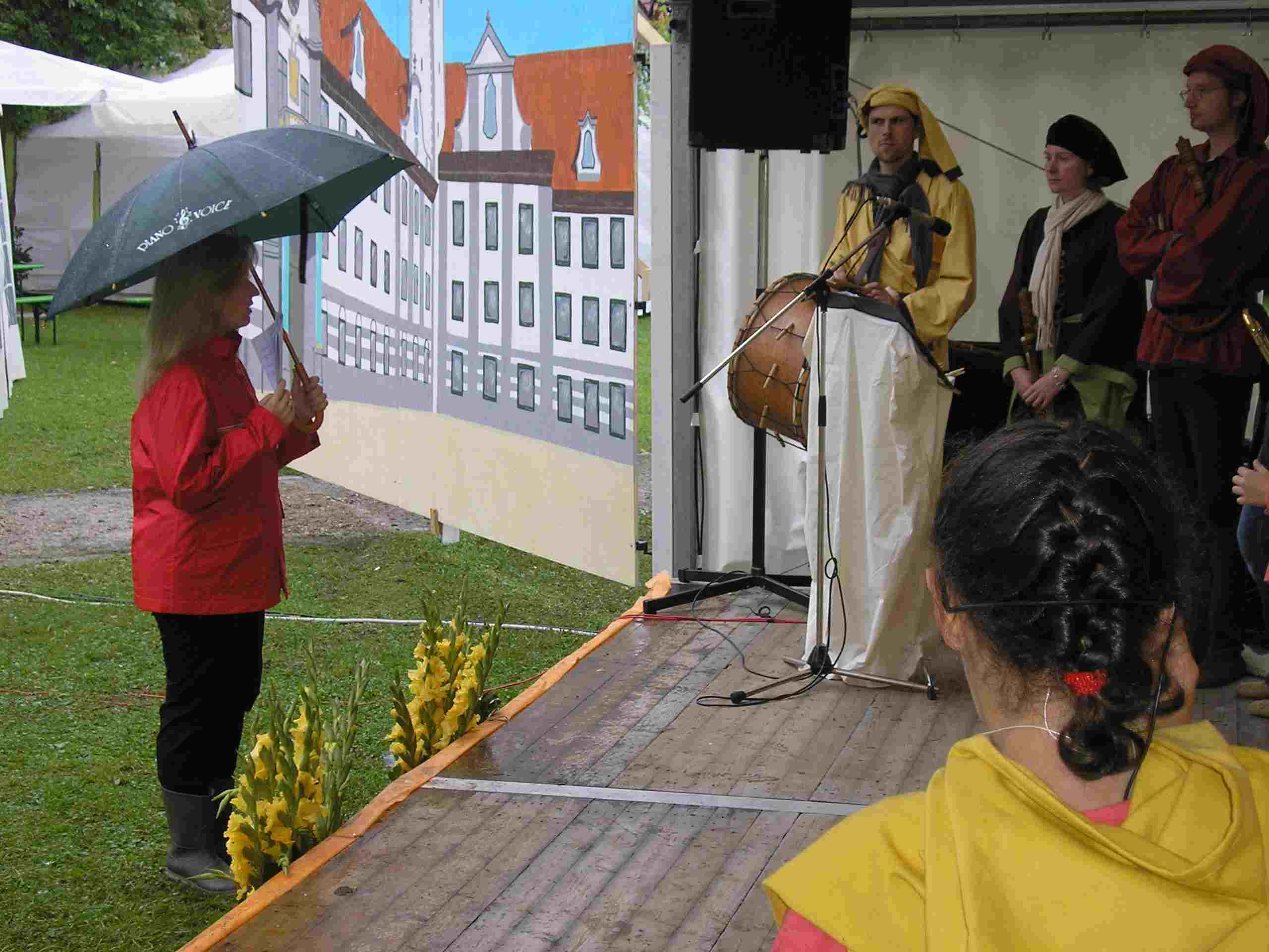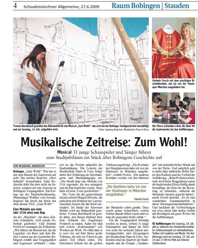 Zum Stadtjubiläum von Bobingen entstand das Musical „Zum Wohl!“, eine fantasievolle Zeitreise durch die Geschichte der Stadt. Im Mittelpunkt stand Reporter „Herr Schmidt“, der gemeinsam mit dem Minnesänger Walther vom Auwald den Ursprüngen des Zuprostens nachgeht und dabei den Legenden von Razo und dem Bäcker Luitnot begegnet. Eine Melodie aus dem Jahr 1516 wurde neu arrangiert und als Rap bearbeitet. Die neuen Liedtexte stammen von Stefanie Fersch. Für die aufwendige Inszenierung entstand ein großes historisches Bühnenbild. Neun Kulissenmaler arbeiteten an monumentalen Bildtafeln. Die Kostüme wurden teils von der Bayerischen Staatsoper ausgeliehen, teils von Eltern nach historischen Vorlagen genäht. Mitwirkende waren über 30 Kinder und Jugendliche im Alter von sechs bis sechzehn Jahren aus den Gesangs- und Chorgruppen von Piano & Voice, ergänzt durch ein Quartett der Stadtkapelle und die Mittelaltergruppe Tandaradei. Zahlreiche Eltern und Helfer unterstützten das Projekt, das über ein Jahr lang vorbereitet wurde – ein eindrucksvolles Gemeinschaftswerk, das Bobingens Geschichte lebendig werden ließ.