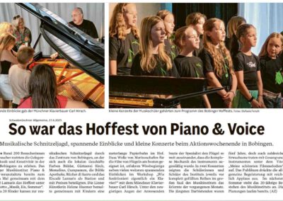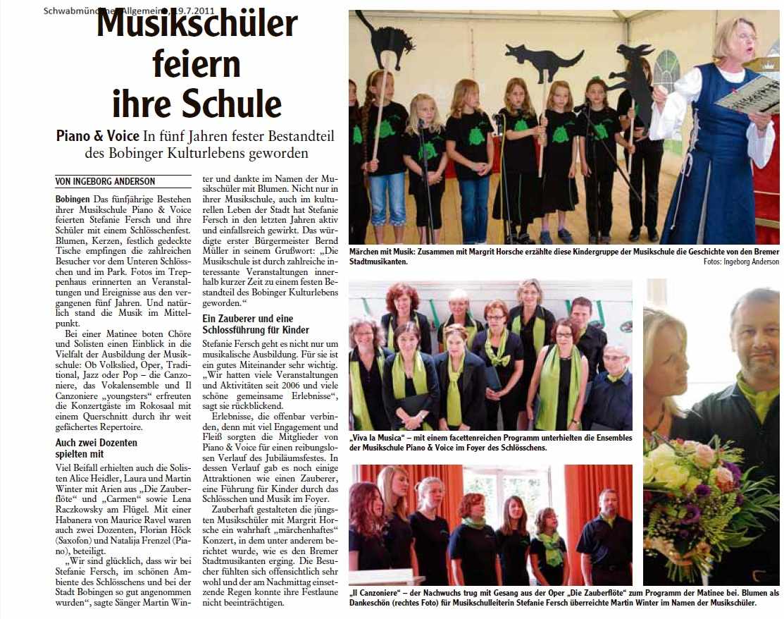 Zum fünfjährigen Bestehen veranstaltete Piano & Voice ein fröhliches Schlösschenfest im Park und im Gebäude. Wie sehr das Musikinstitut inzwischen die Stadt bereicherte, stellten nicht nur die Gäste fest, sondern auch der erste Bürgermeister Bernd Müller in seinem Grußwort: „Die Musikschule ist durch zahlreiche interessante Veranstaltungen innerhalb kurzer Zeit zu einem festen Bestandteil des Bobinger Kulturlebens geworden.“