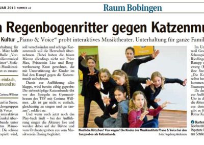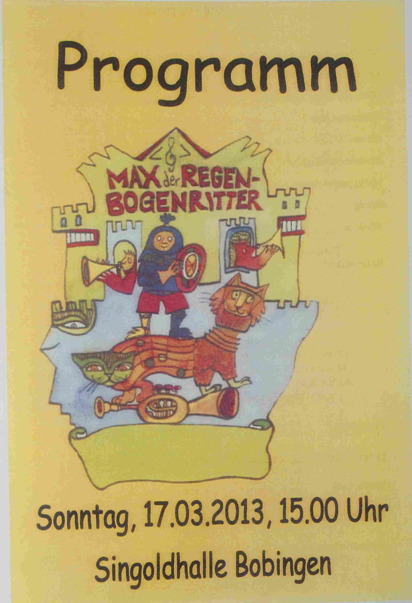 Das Highlight des Jahres 2013 bildete die große Aufführung des Musicals „Max, der Regenbogenritter“ in der Singoldhalle Bobingen. Das Musical von Christian Kunkel wurde durch die Bank mit Akteuren des Musikinstituts besetzt, das Orchester des