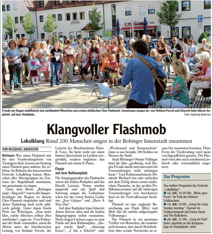 Im Rahmen des bayernweiten Festivals „Lokalklang“ beteiligte sich die Stadt Bobingen unter der künstlerischen Leitung von Stefanie Fersch mit einem musikalischen Flashmob. Unter dem Motto „Bobingen singt – Sing mit!“ sangen zahlreiche Menschen an diversen öffentlichen Plätzen in Bobingen.