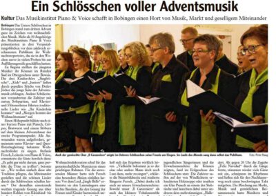 Seit 2014 fand die Adventsmusik des Musikinstituts zudem im Unteren Schlösschen statt. „Wir kombinieren unser Adventskonzert mit einem für alle offenen Schlösschen, durch das von überall Musik erklingt und vorweihnachtliche Begegnung in unkomplizierter Atmosphäre möglich ist,“ erläuterte Stefanie Fersch. Neben mehreren musikalischen Konzertteilen mit allen Ensembles, Chorgruppen sowie kleinen Solisten gab es Musik von Klassik bis Moderne, einen kleinen Weihnachtsmarkt mit Glühwein, Punsch, Crêpe und Geschenken. Gäste waren die Zithergruppe der D’Hochsträssler und die Märchenerzählerin Margit Horsche.