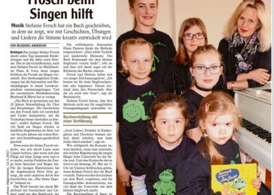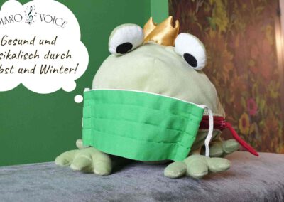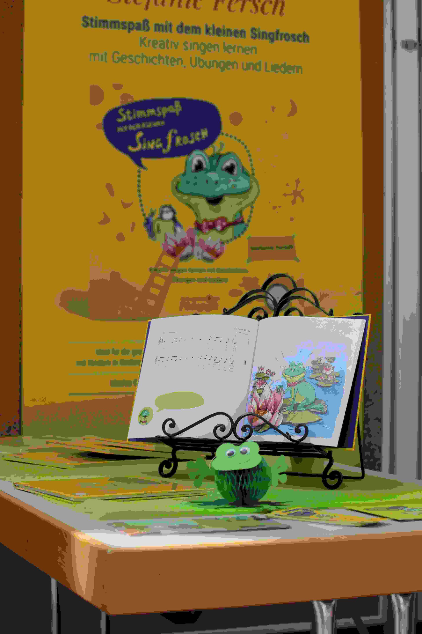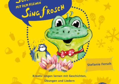 Breitkopf & Härtel erschien. In eigens entwickelten Geschichten und selbst komponierten Liedern bringt die Gesangspädagogin die Technik ganz spielerisch rüber. Die süßen Illustrationen stammen von Petra Götz. Im Zentrum und titelgebend: der Singfrosch, seit Langem das Markenzeichen für die jüngsten Chorgruppen bei Piano & Voice. Das Lehrbuch umfasst eine CD mit selbst eingesprochenen und eingesungen Liedern sowie ein Lehrerheft mit Klavierstimme.