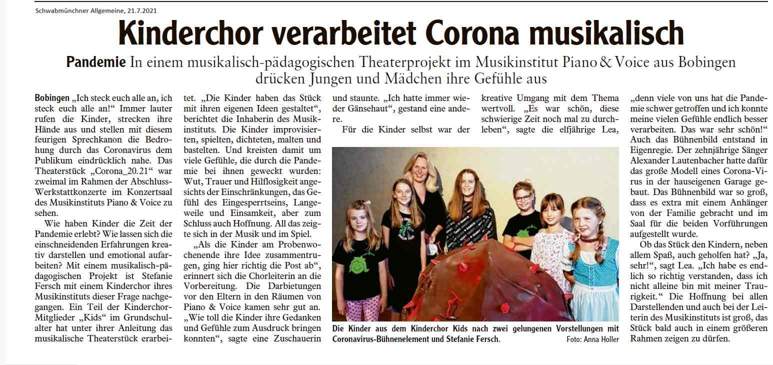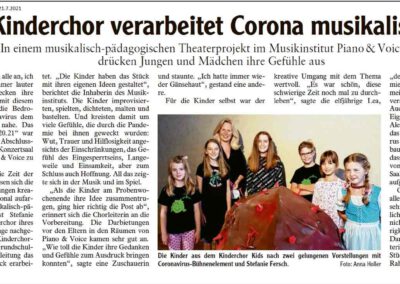Um Kindern und Jugendlichen zu ermöglichen, diese Zeit zu verarbeiten, entwickelt Stefanie Fersch ein besonderes musikalisch-pädagogisches Projekt: Das Theaterstück „Corona_20.21“ drehte sich in selbst komponierten Stücken um die Erlebnisse der Kinder während der Pandemie. Die Kinder improvisierten, spielten, dichteten, malten und bastelten. Und kreisten damit um ihre Wut, Trauer und Hilflosigkeit angesichts der Einschränkungen, das Gefühl des Eingesperrtseins, Langeweile und Einsamkeit, aber zum Schluss auch Hoffnung.